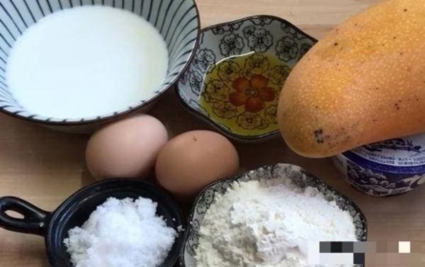 Nguyên liệu cần chuẩn bị: Xoài, trứng, bột mì gluten, đường, dầu ăn, sữa tươi không đường, sữa chua.