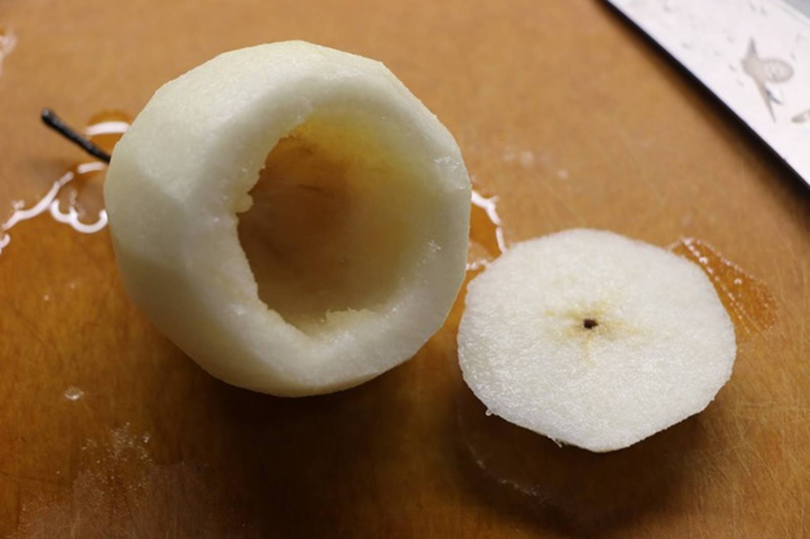 Với lê, bạn rửa sạch rồi gọt vỏ, cắt lấy 1 khoanh dày khoảng 1-1,5 cm ở phần đáy quả lê. Sau đó, tiến hành khoét ruột lê.