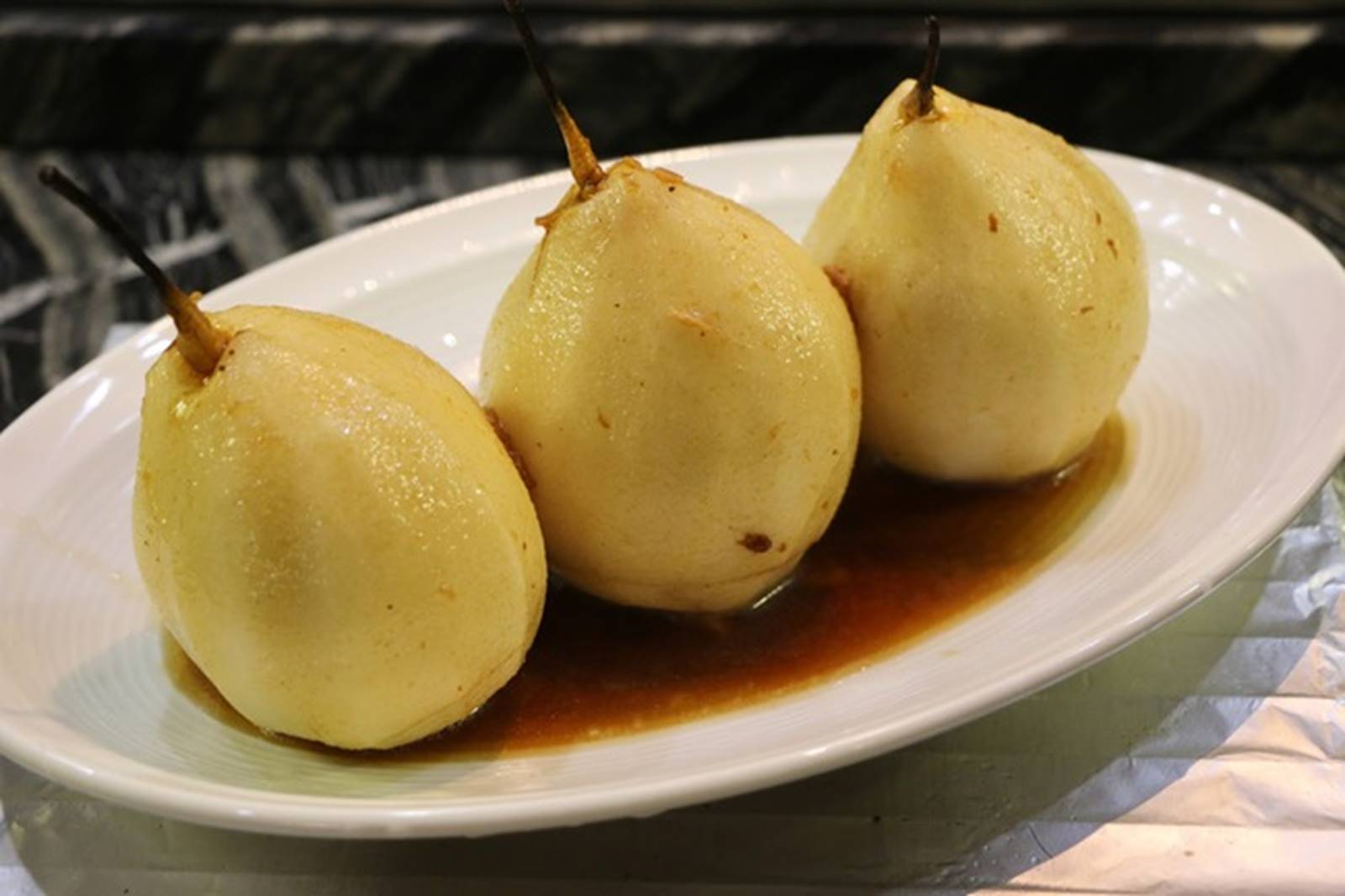 Giờ thì bạn chỉ cần dùng dao và dĩa, cắt trái lê nhồi thịt sườn này thành miếng nhỏ là có thể thưởng thức được rồi.