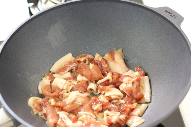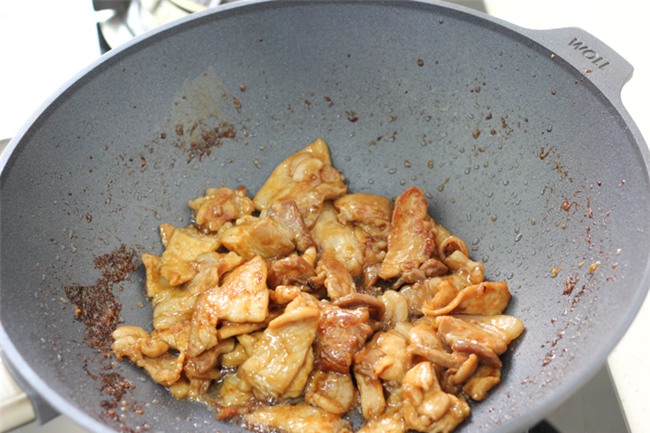 Đun nóng một ít dầu ăn trong chảo, cho thịt đã ướp gia vị vào rán.