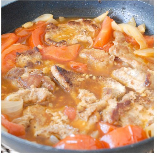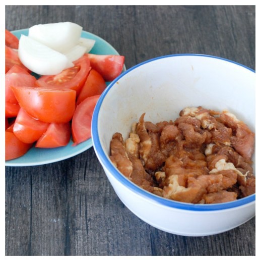Cà chua rửa sạch bổ múi cau, thực hiện tương tự với hành tây. Thịt heo rửa sạch, thái miếng dày chừng 3mm ướp với nước tương và bột ngô trong vòng 30 phút.