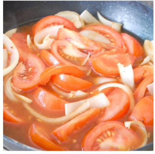 Cho chút dầu vào chảo, thêm hành tây vào đảo cho hành chín tái thì cho cà chua và chút nước, thêm đường, muối và ketchup vào đun cho tới khi cà chua mềm.