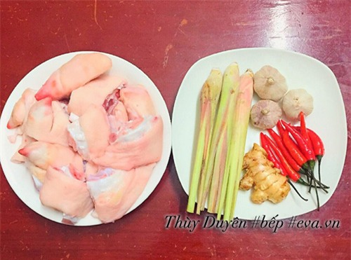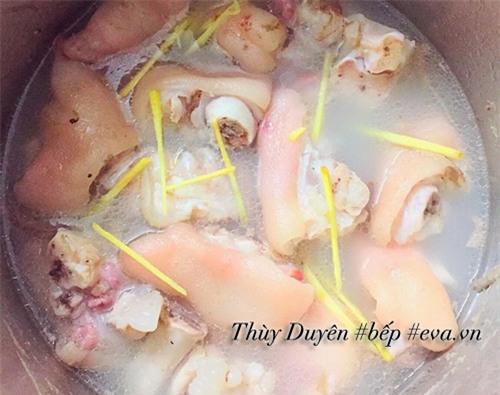 Bước 1: Móng giò mua về rửa sạch, đun sôi nước, thả móng giò vào chần qua vớt ra xả sạch bẩn. Đun sôi nồi nước khác cho thêm 1 thìa muối và mẩu gừng đập dập rồi cho móng giò vào luộc chín.