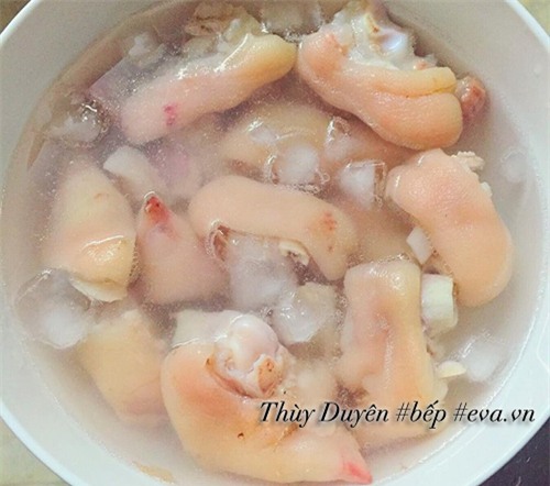 Bước 2: Móng giò chín, vớt ra thả vào bát nước đá rồi vớt ra để nguội và thật ráo nước. Cho vào tủ lạnh khoảng 15 phút cho móng giò săn và giòn hơn.
