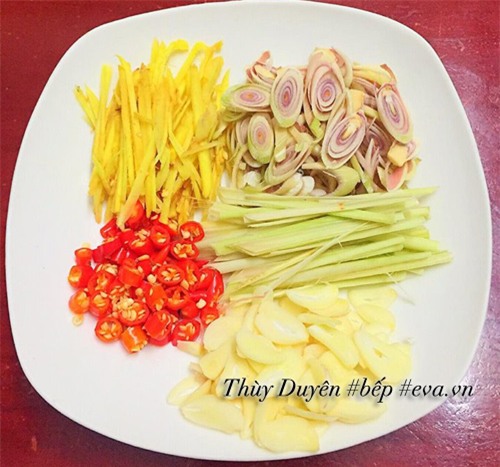Bước 3: Sả cắt khúc, chẻ nhỏ hoặc thái lát. Gừng thái chỉ. Ớt cắt miếng nhỏ. Tỏi bóc vỏ thái miếng mỏng.