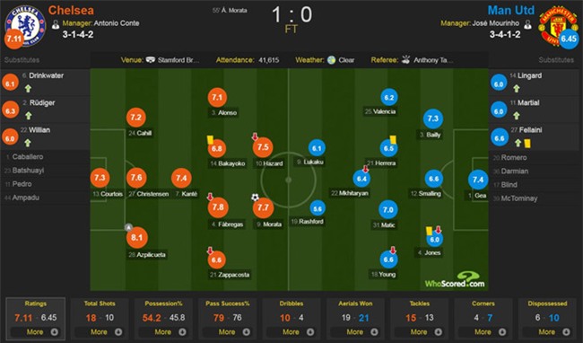 Bước sang hiệp thi đấu thứ 2, hàng thủ Man Utd không còn duy trì được sự tập trung và để lộ những khoảng trống chết người, đặc biệt là ở vị trí của Phil Jones. Phút 55 từ đường treo bóng của Azpilicueta, Alvaro Morata trừng phạt đội khách bằng một pha bật cao đánh đầu không thể cản phá.