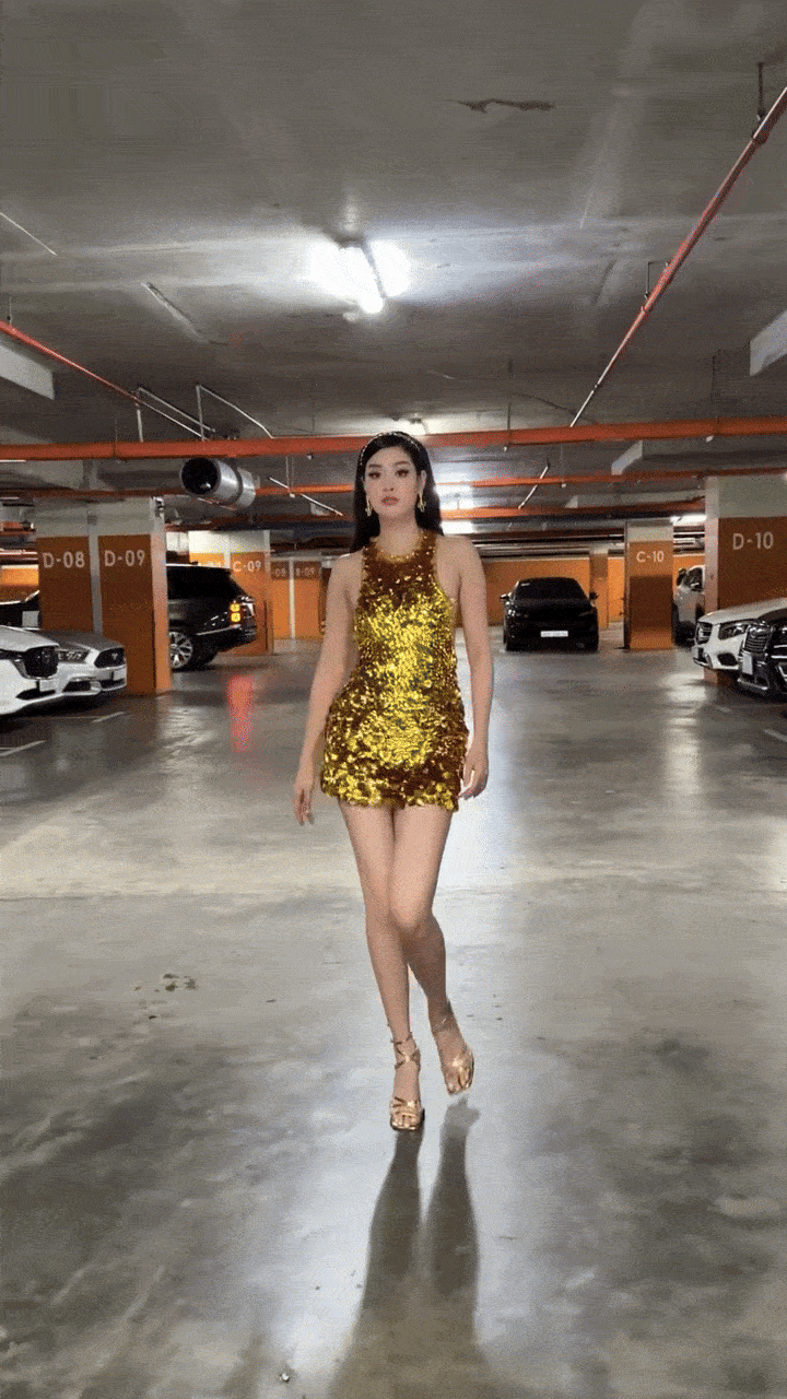 Trong clip, người đẹp diện đầm màu vàng được đính kết cầu kì khoe triệt để đôi chân dài thẳng tắp. Diện đầm ôm sát, Khánh Vân để lộ vòng hai nhô cao. Catwalk trên đôi giày cao gót nhưng người đẹp di chuyển khá chậm rãi, bước từng bước chắc nịch và cẩn thận hơn thường ngày.