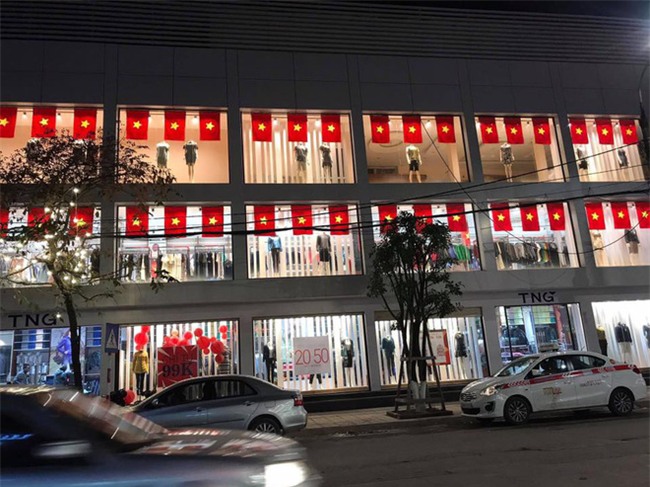 Hòa vào không khí tưng bừng chung của cả nước khi tất bật chuẩn bị cổ vũ cho đội tuyển U23 Việt Nam trước trận chung kết, rất nhiều cửa hàng trên đường phố đã trang trí theo đúng "chủ đề", rực rỡ với những lá cờ đỏ treo kín từ trên xuống dưới khiến người đi đường thích thú.