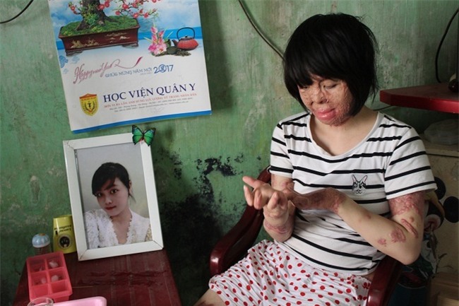 Từ cô gái có làn da mịn màng, trắng trẻo... giờ đây gương mặt Dung là những mảng sẹo lồi lõm, nhiều vùng da bật máu. Mái tóc dài mượt mà ngày xưa giờ lởm chởm, khô cứng, được túm gọn dây chun đằng sau để Dung tiện sinh hoạt.