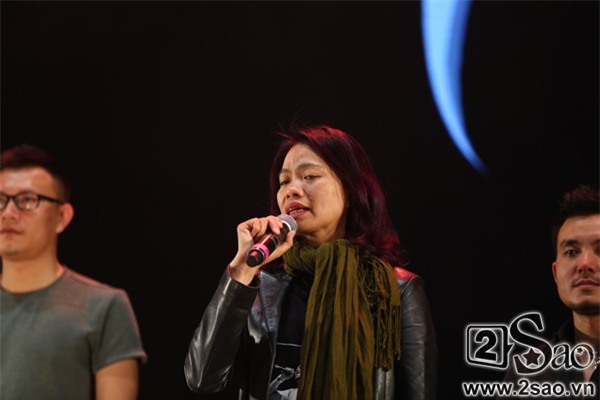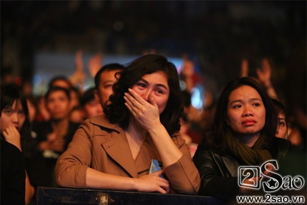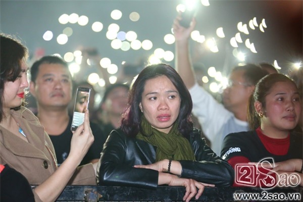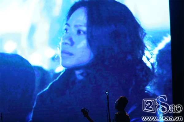 Vợ Trần Lập bật khóc khi nghe lại ca khúc "Mắt đen" qua giọng ca của chồng được phát lại trên khắp sân khấu.