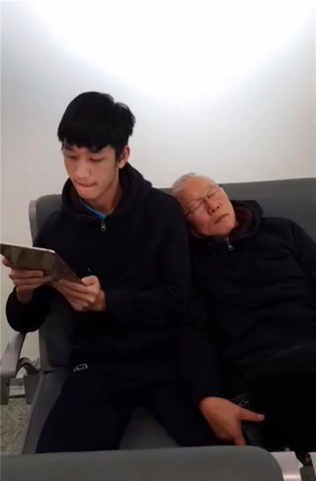 Trước đó tại phòng chờ sân bay Thường Châu, ông Park đã có hành động đáng yêu khi kéo vai cầu thủ Trọng Đại để ngủ. Hình ảnh được cắt ra từ đoạn clip livestream trên FB ngay trước khi ông cùng các học trò lên máy bay trở về Việt Nam.