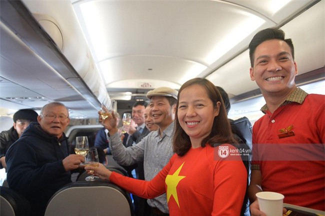 Trong chuyên cơ riêng của một hãng hàng không, HLV Park ăn mừng thành công cùng người hâm mộ và phi hành đoàn.