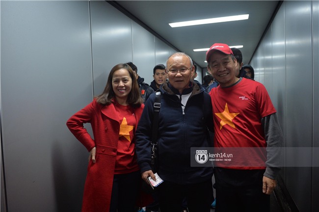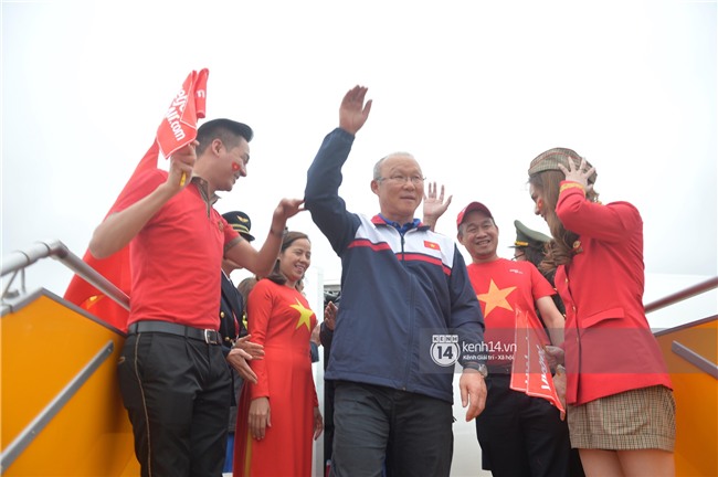Là người đầu tiên của đoàn đội tuyển U23 Việt Nam bước ra khỏi máy bay, HLV Park rạng rỡ vẫy tay chào cổ động viên.