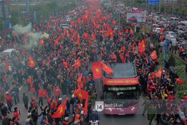 Sau đó, đoàn xe của đội tuyển Việt Nam đã đi qua cầu Nhật Tân và bắt đầu tiến vào thành phố.
