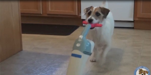 Công việc hút bụi có vẻ rất thú vị với chú chó này.