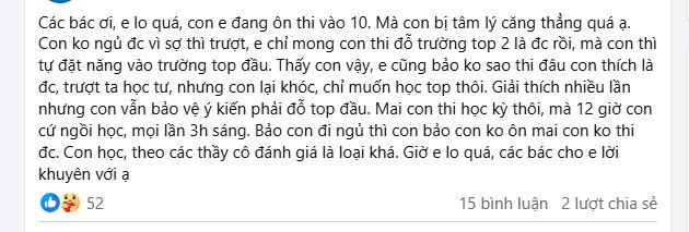 Cụ thể, phụ huynh này cho biết, con mình đang bị căng thẳng tâm lý quá mức. Con vốn có học lực khá, bố mẹ không tạo áp lực, chỉ cần con đỗ trường top 2 là được nhưng con tự đặt mục tiêu phải đỗ trường top đầu. Gần đây, con hay mất ngủ vì sợ thi trượt.