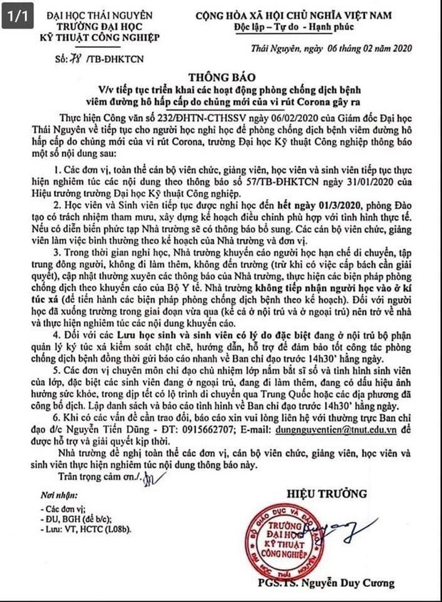Hôm 6/2, trường Đại học Kỹ thuật Công nghiệp Thái Nguyên - Đại học Thái Nguyên đã có thông báo về việc tiếp tục triển khai các hoạt động phòng chống dịch bệnh viêm đường hô hấp cấp do chủng mới của virus corona gây ra. Trong thông báo số 78/TB-ĐHKTCN có nội dung: "Học viên và Sinh viên tiếp tục được nghỉ học đến hết ngày 01/3/2020, phòng Đào tạo có trách nhiệm tham mưu, xây dựng kế hoạch điều chỉnh phù hợp với tình hình thực tế. Nếu có diễn biến phức tạp Nhà trường sẽ có thông báo bổ sung. Các cán bộ viên chức, giảng viên làm việc bình thường theo kế hoạch của Nhà trường và đơn vị."