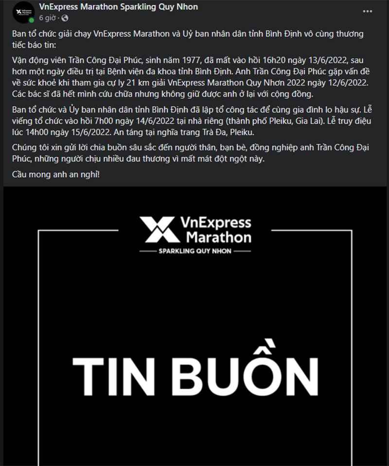 Cụ thể, theo thông báo của Ban tổ chức (BTC) giải chạy Marathon Quy Nhơn đăng tải, vận động viên (VĐV) Trần Công Đại Phúc (SN 1977, ngụ TP Pleiku, tỉnh Gia Lai) đã qua đời vào hồi 16h20 hôm qua (13/6) sau hơn 1 ngày điều trị tại Bệnh viện Đa khoa tỉnh Bình Định.