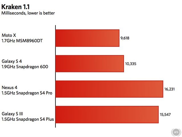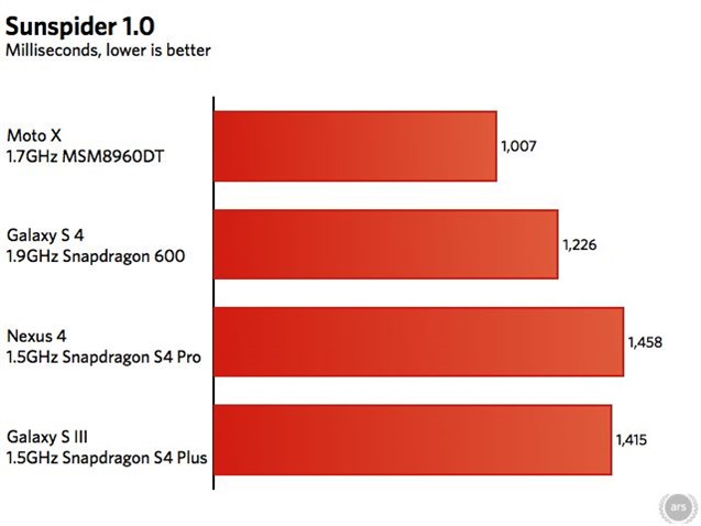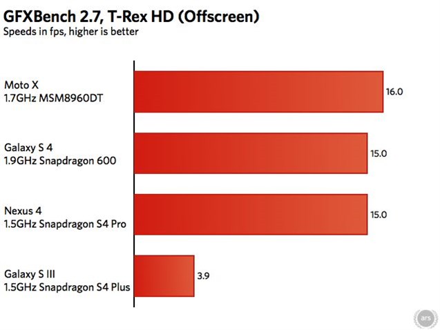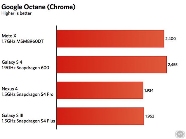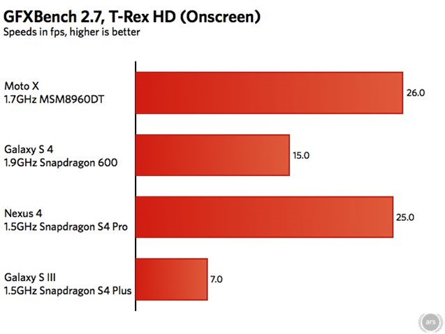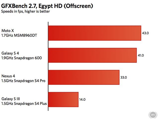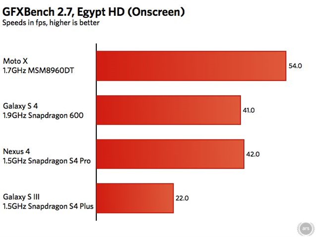 Nói gì thì nói, chúng ta vẫn cần một số “dẫn chứng” khẳng định điều điều này. Không ngoài những phỏng đoán, Moto X đánh bại Samsung Galaxy S4 hầu như ở mọi thử nghiệm GPU, ngay cả SunSpider, Kraken, và cả Google Octane (Chrome). Điểm benchmark duy nhất của Moto X yếu thế so với S4 chính là ở Geekbench, tuy rằng chưa đánh giá được sự khác biệt ở các thử nghiệm thực tế. Nhưng đối với hiệu suất GPU là khá rõ rệt, chứng tỏ những phản hồi từ GPU 4 lõi hoạt động dựa trên màn hình độ phân giải 720p đã có hiệu lực.