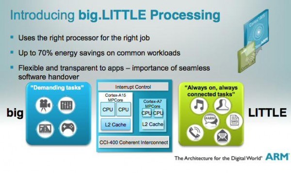 Ngoài lề một chút với chipset 8 nhân mang tính “thổi phồng” của Samsung. Exynos 5 hoạt động dựa trên cấu trúc ARM big.LITTLE, với 4 nhân xử lý A15 hỗ trợ thiết bị hoạt động dưới tác vụ nặng, 4 nhân A7 đảm đương tác vụ nhẹ. Hạn chế trong cấu trúc thiết kế của big.LITTLE chính là không thể pha trộn, hoạt động liền lạc hoặc bổ trợ lẫn nhau trong quá trình thực thi giữa các lõi. Một là chỉ có A15 chạy, hoặc chỉ có A7 chạy, và A7 cũng không thể hoạt động với các tụ nặng, ngược lại A15 cũng vậy.