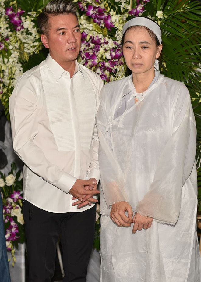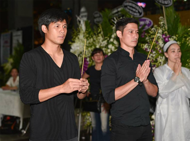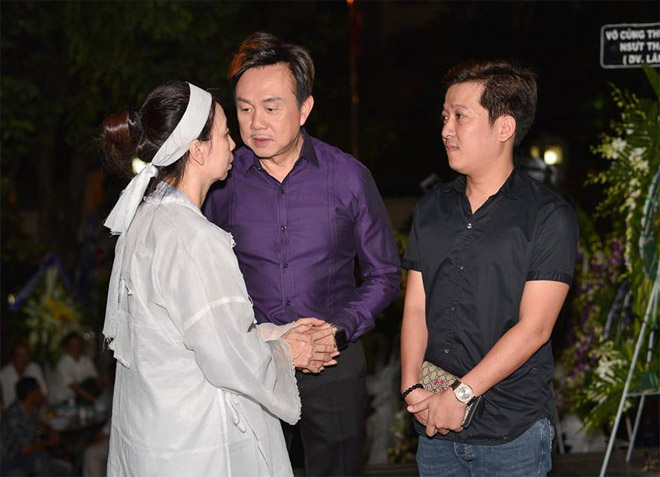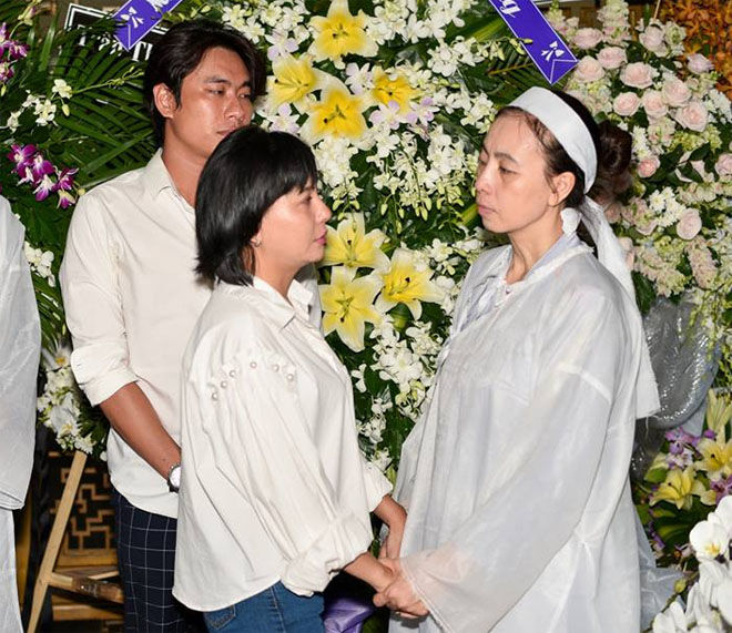 Dù bận rộn lịch diễn, cả hai và nhiều nghệ sĩ nổi tiếng vẫn cố gắng có mặt trong đêm cuối trước khi linh cữu nghệ sĩ Thanh Hoàng được hỏa táng vào sáng 29/7.