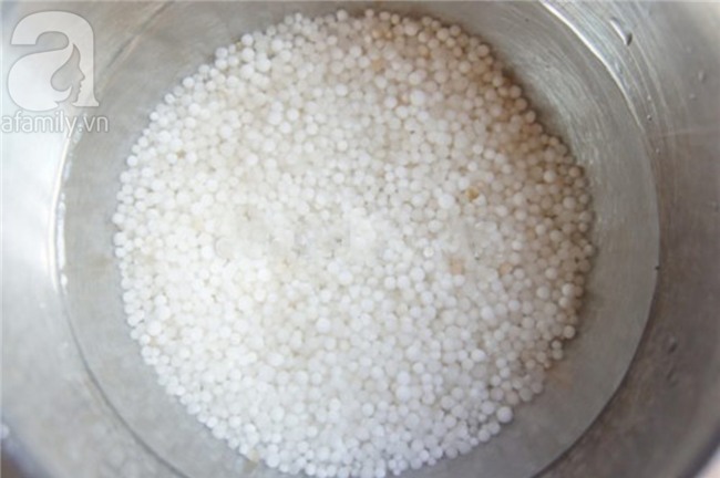 Bột báng ngâm vào nước khoảng 5h trước khi nấu. Đun sôi nước cho bột báng vào luộc chín rồi vớt ra tô nước lạnh.