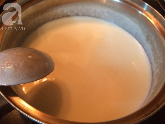 Cho nước cốt dừa, sữa đặc vào nồi khuấy đều đun sối lăn tăn thì tắt bếp để nguội cho bột báng vào.