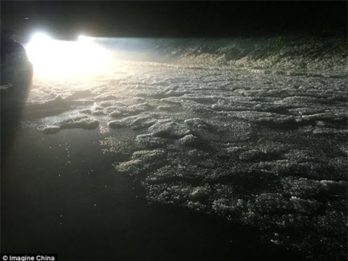 Đá băng phủ một lớp dày trên mặt đường sau trận mưa đá ở tỉnh Quý Châu. |