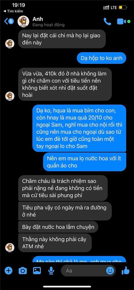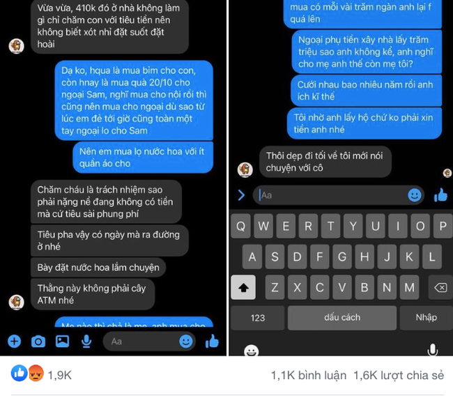 Theo đó, người vợ mua đồ để tặng quà 20/10 cho mẹ đẻ mình và nhận về phản ứng đầy phẫn nộ của chồng. Anh ta cho rằng cô ăn bám tiêu hoang và không nên tặng mẹ vợ cái gì cả vì chuyện chăm sóc cho cháu là trách nhiệm của bà. Đoạn hội thoại của hai người như sau: