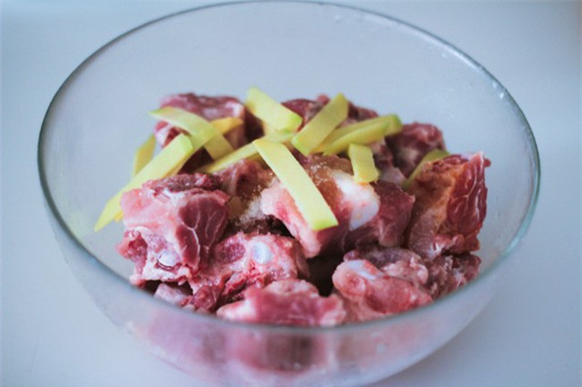 -Xương sườn rửa sạch nhiều lần dưới nước rồi vớt ra để ráo, cho gừng thái lát mỏng, 1 thìa rượu gạo, 2 thìa đường, 1 nhúm muối sau đó ướp trong tủ lạnh từ 3-4 tiếng.