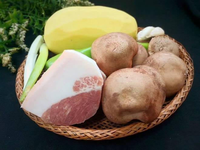 - 1 củ khoai tây to, 6 cái nấm hương tươi, 100g thịt lợn (bạn có thể thay thế bằng thịt bò), hành lá, tép tỏi, 1 quả ớt ngọt xanh, rượu nấu ăn, muối, bột nêm (tùy ý), nước tương và dầu hào.