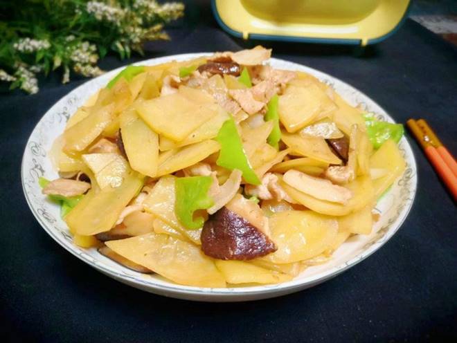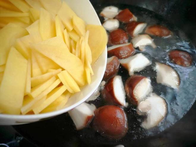 Cho khoai tây thái lát mỏng và nấm hương vào xào nhanh tay. Nêm muối vừa ăn, bột nêm (tùy ý), 1 thìa nước tương, 1 thìa dầu hào vào xào cho đến khi có mùi thơm. Khoai tây và nấm hương đã được chần qua và gần chín nên khi xào không cần xào lâu. Cho ớt xanh vào, xào thêm 1 phút là xong.