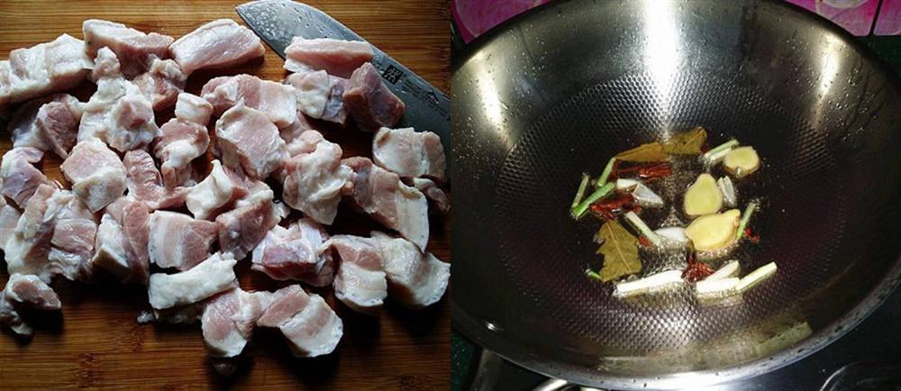 Thịt ba chỉ rửa sạch, thái miếng vừa ăn. Đun nóng chút dầu ăn trong chảo rồi cho gừng, hành, hoa hồi, lá nguyệt quế, quế vào xào thơm sau đó cho ra bát.