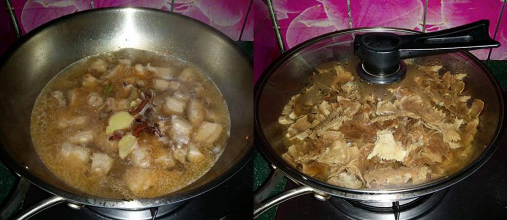 Đổ nước ngập mặt thịt, thêm các loại gia vị thơm đã xào vào. Trải đều măng khô lên trên rồi đậy nắp chảo lại đun sôi.
