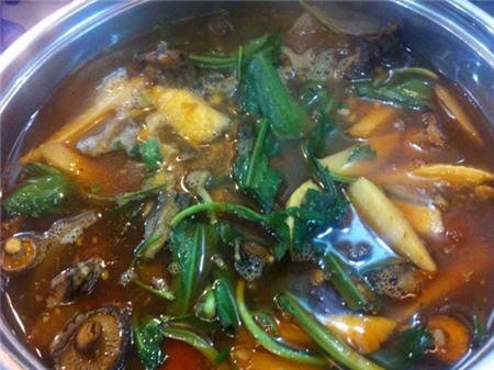 món lẩu vẫn được bảo toàn, thịt ếch khá nhiều, nước dùng, rau hay măng