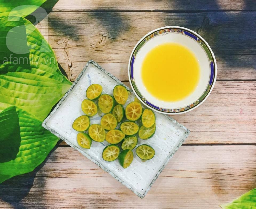 Quất cắt làm đôi. Vắt lấy nước cốt, lọc bỏ hạt.