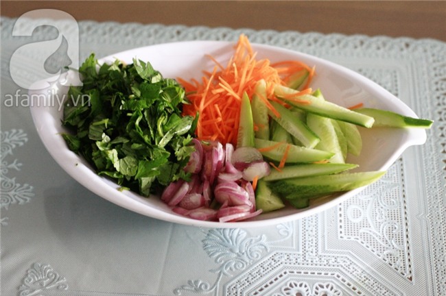 Cà rốt, dưa leo rửa sạch. Bào nhỏ cà rốt và thái lát mỏng dưa chuột. Hành tím xắt nhỏ, ngâm vào nước pha dấm cho bớt hăng.