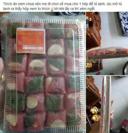 Thích ăn nem chua nên khi mẹ đi chơi, cô gái trẻ V.T.T.Như đã rất hào hứng nhờ mẹ mua về làm quà. Tuy nhiên, khi nhận được hộp nem từ mẹ, theo cô nàng kể: Lúc mở tủ lạnh ra thấy hộp nem to thích mà tới khi lấy ra thì… xém ngất. Bên mặt trên của hộp xếp đầy 24 chiếc nem chua nhưng ở mặt dưới 2/3 hộp thực chất lại được độn bằng bìa cát tông. T.Như cũng cho biết, mẹ cô mua hộp nem này với giá 45 nghìn.