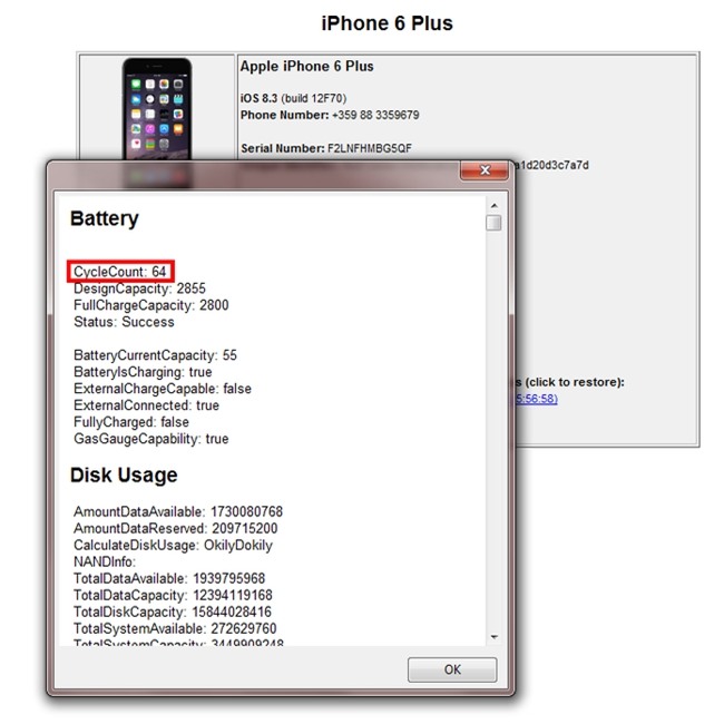 Giờ thì bạn đã nhìn thấy được bảng thông tin mà mình muốn trong đó Cycle Count tức là số lần iPhone đã được sạc đầy, Design Capacity là dung lượng pin theo nhà sản xuất và Full Charge Capacity là dung lượng pin thực tế khi được nạp đầy. Chiếc iPhone được sạc càng ít chứng tỏ nó càng mới.