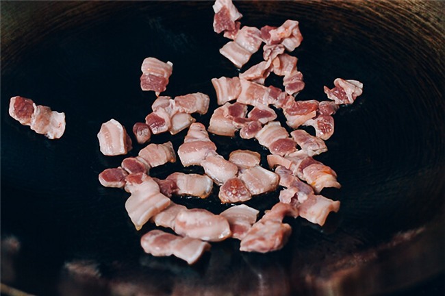 Làm nóng chảo với ít dầu ăn, cho thịt ba chỉ cắt miếng nhỏ vừa ăn vào chiên sơ 1 phút cho ra thêm mỡ.