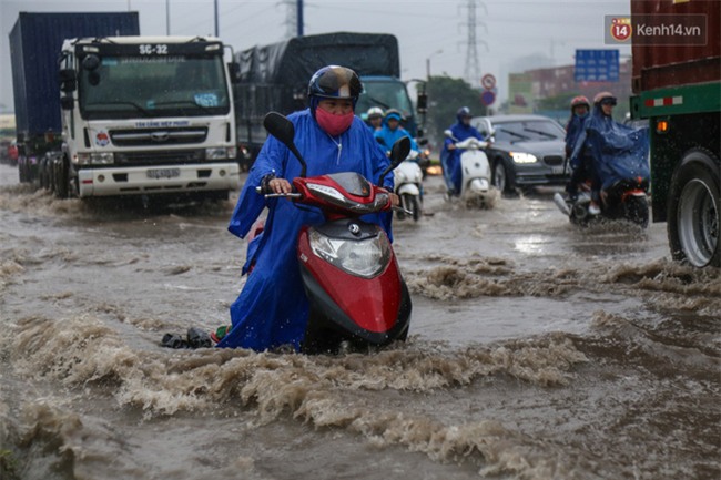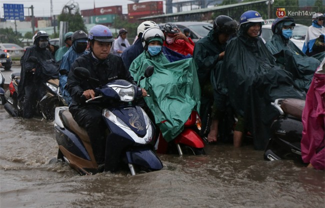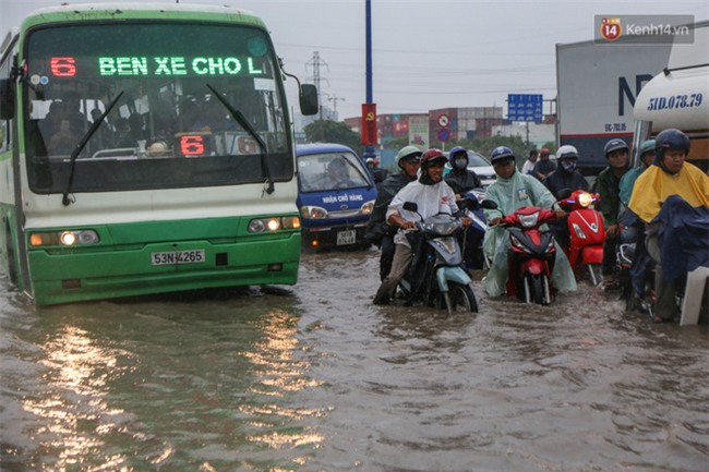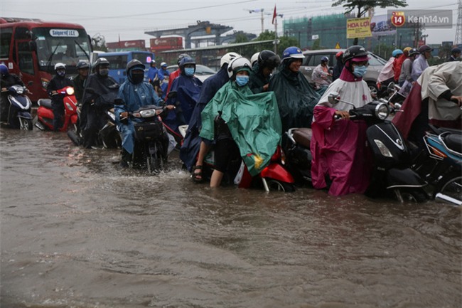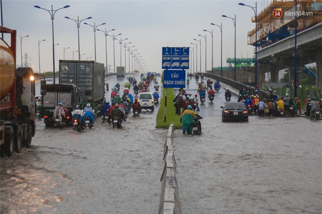 Theo ghi nhận, tình trạng nước ngập sâu xảy ra tại khu vực chân cầu Rạch Chiếc (thuộc khu vực Quận 9 và Thủ Đức hướng về trung tâm TP), hàng trăm phương tiện bị chết máy. Trong khi đó, không ít người đi xe máy buộc phải lưu thông trong làn ô tô để tránh cho xe bị chết máy khiến giao thông càng trở nên ùn tắc.