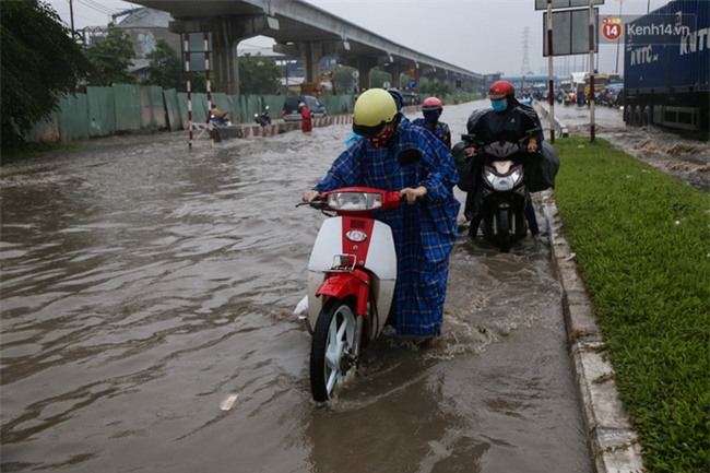 Cả đoạn đường bị chia cắt vì nước ngập sâu, xe máy không thể di chuyển. Một số phải dắt bộ sát mép lề để tránh bị té.