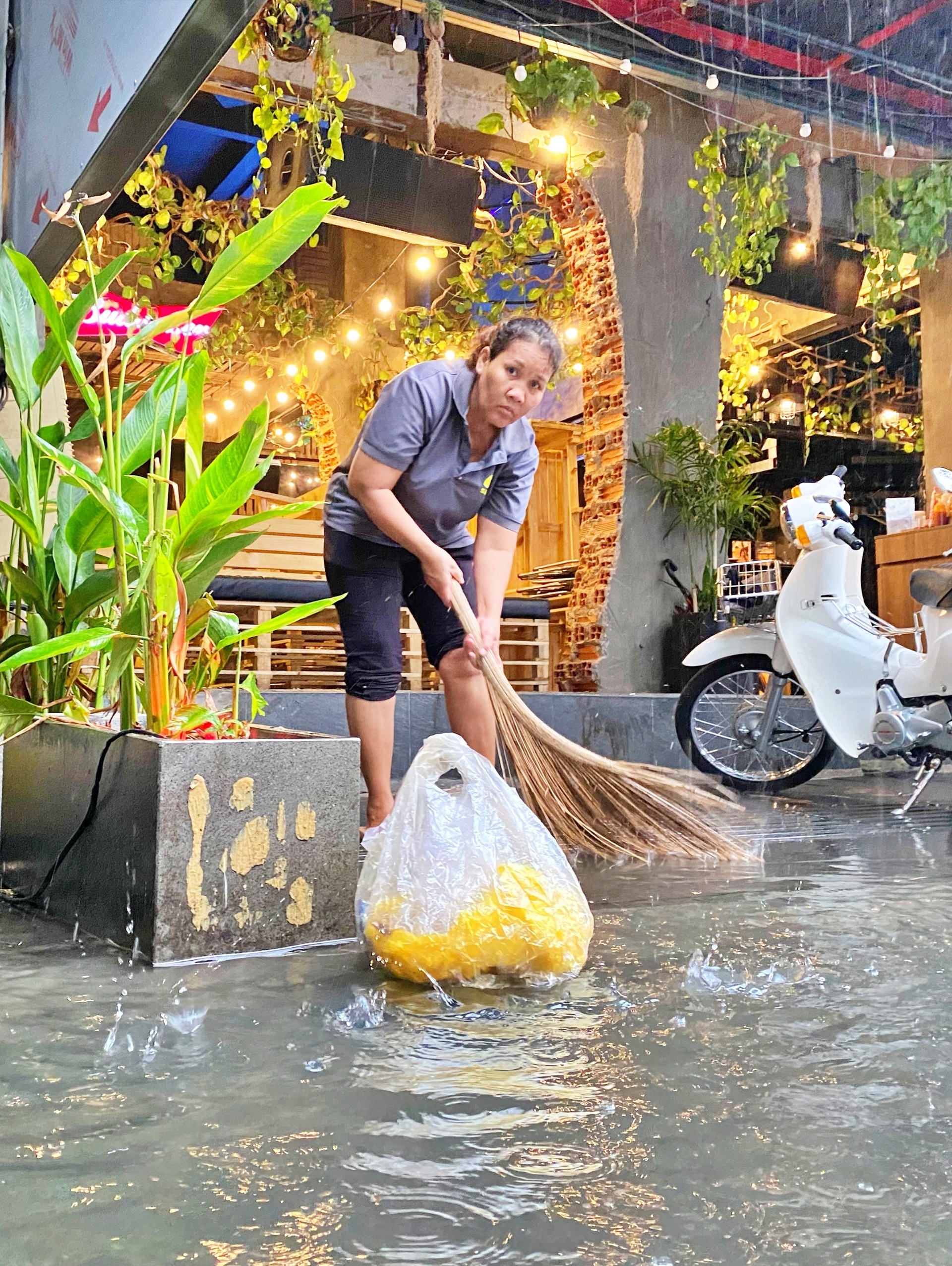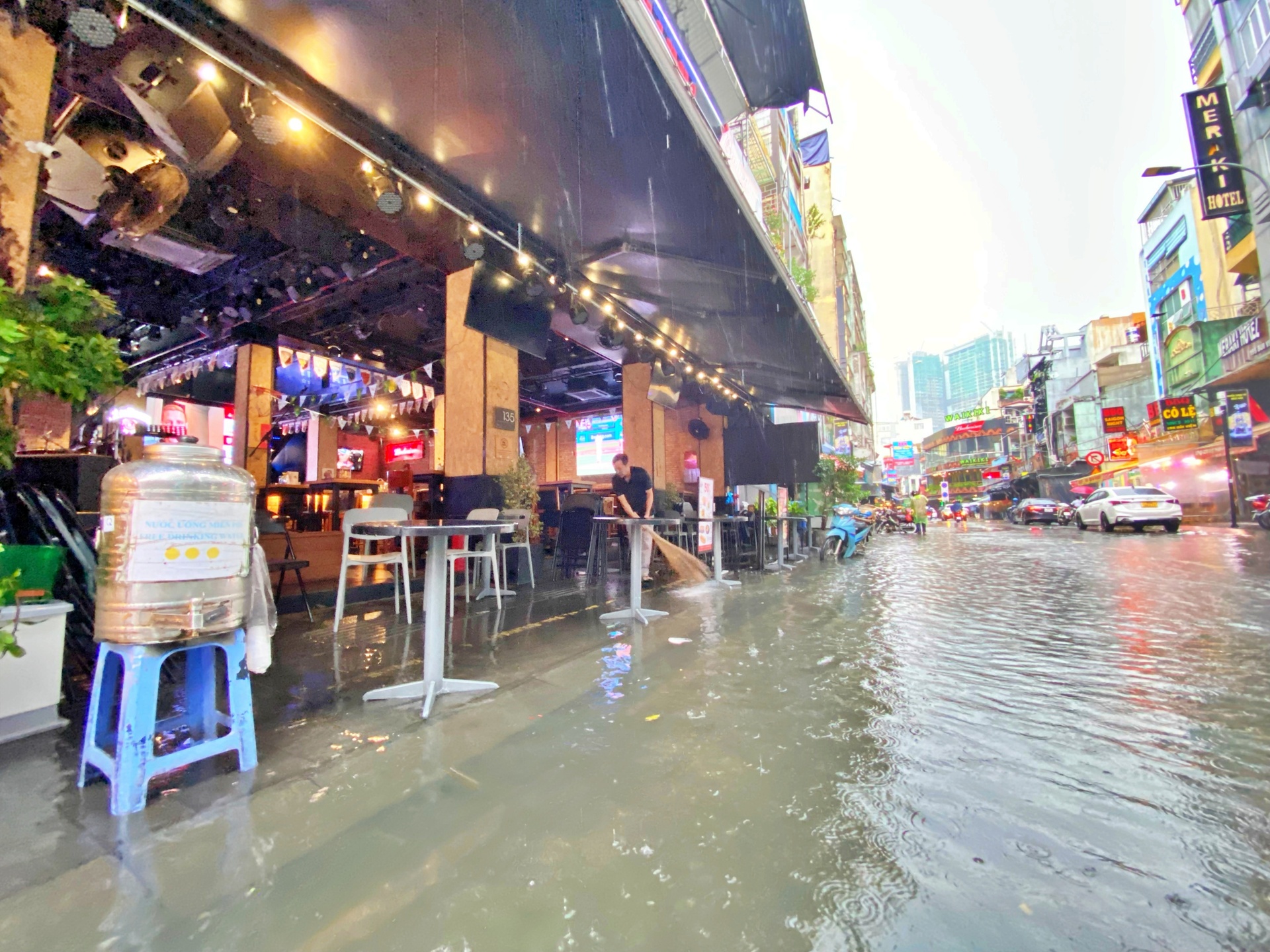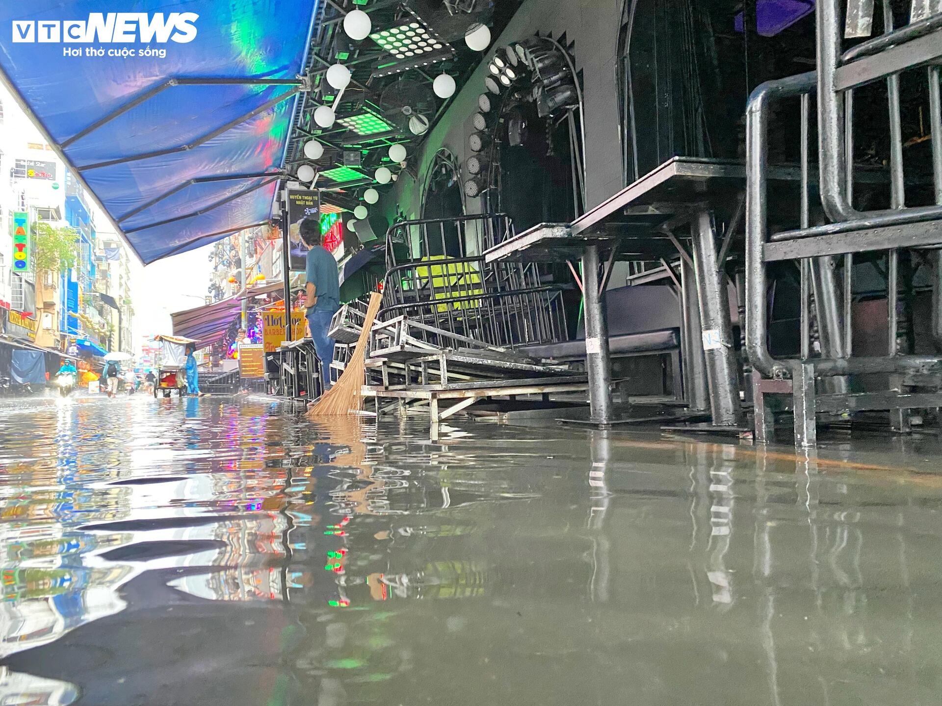 Nhiều cơ sở kinh doanh, hàng quán trên phố đi bộ Bùi Viện (Quận 1) phải kê bàn ghế lên cao và dùng các biện pháp ngăn không cho nước tràn vào nhà.