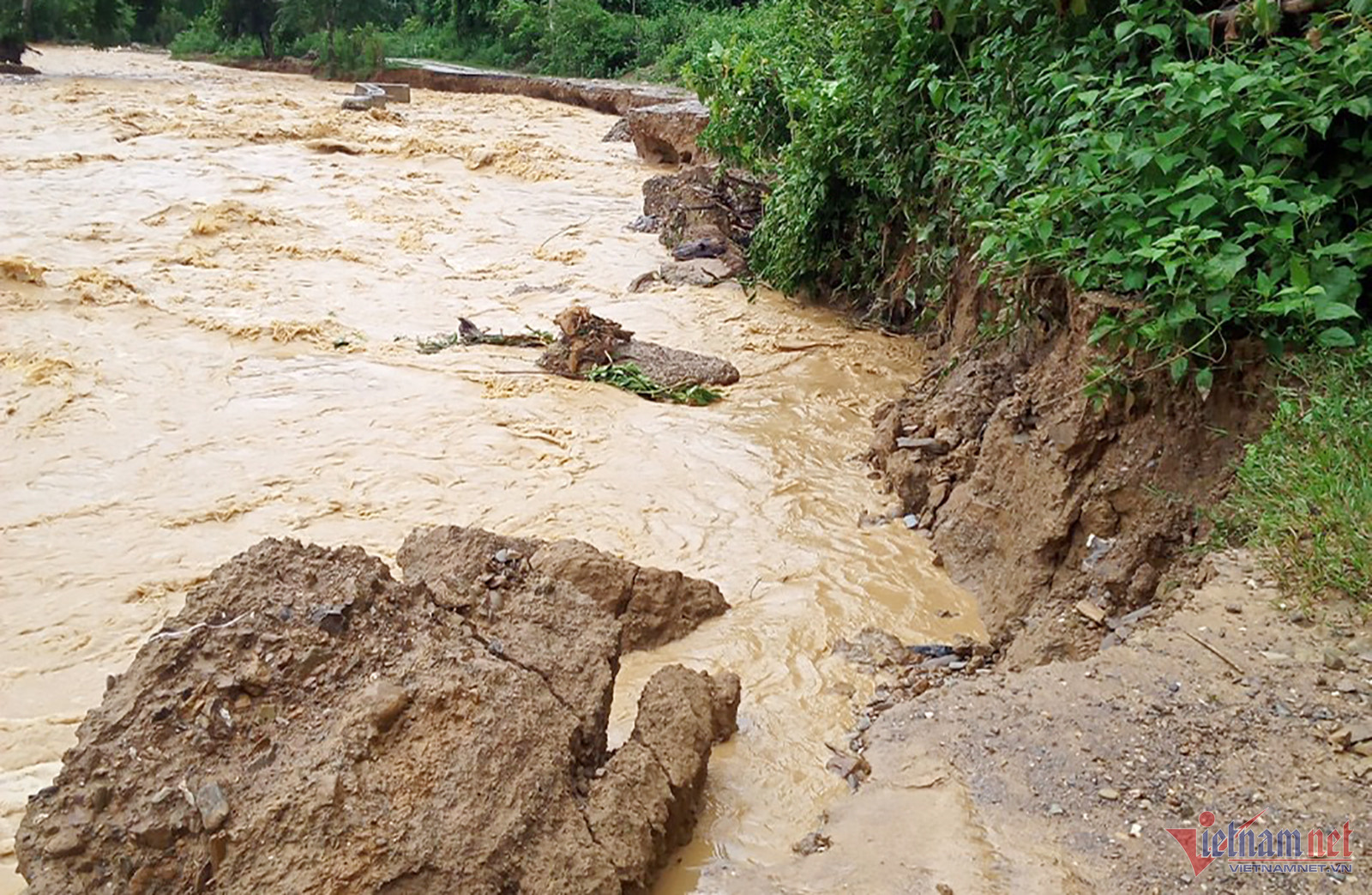 Hơn 100m đường đã bị nước phá hỏng hoàn toàn, chưa mở được lối đi mới. Ảnh: Văn Tám
