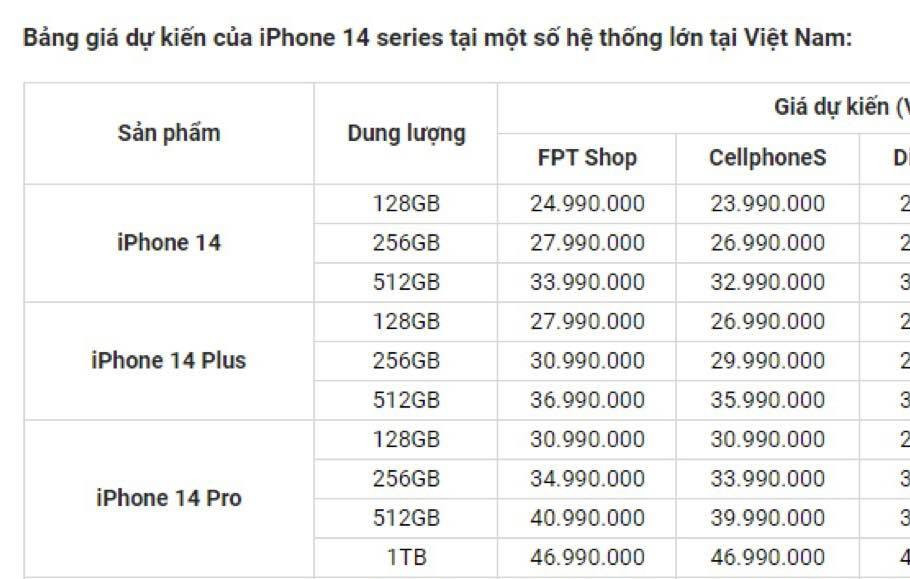 Bảng giá iPhone 14, iPhone 14 Plus, iPhone 14 Pro và iPhone 14 Pro Max tại Việt Nam-1