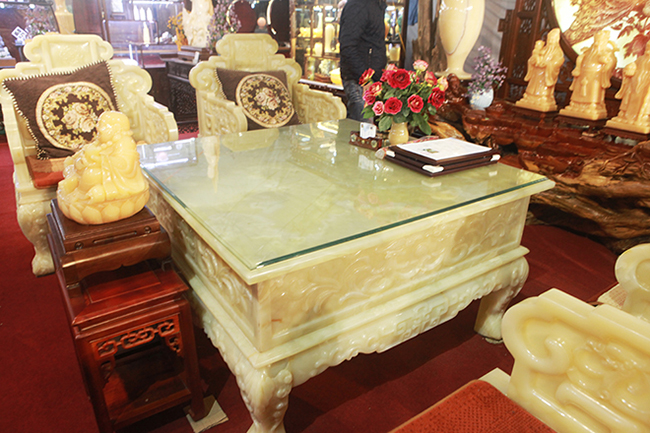 Bộ bàn ghế được chế tác từ 50 tấn ngọc Hoàng Long nhập từ Trung Mỹ, do 10 người làm trong vòng 1 năm mới hoàn thành. Ảnh: Lao động