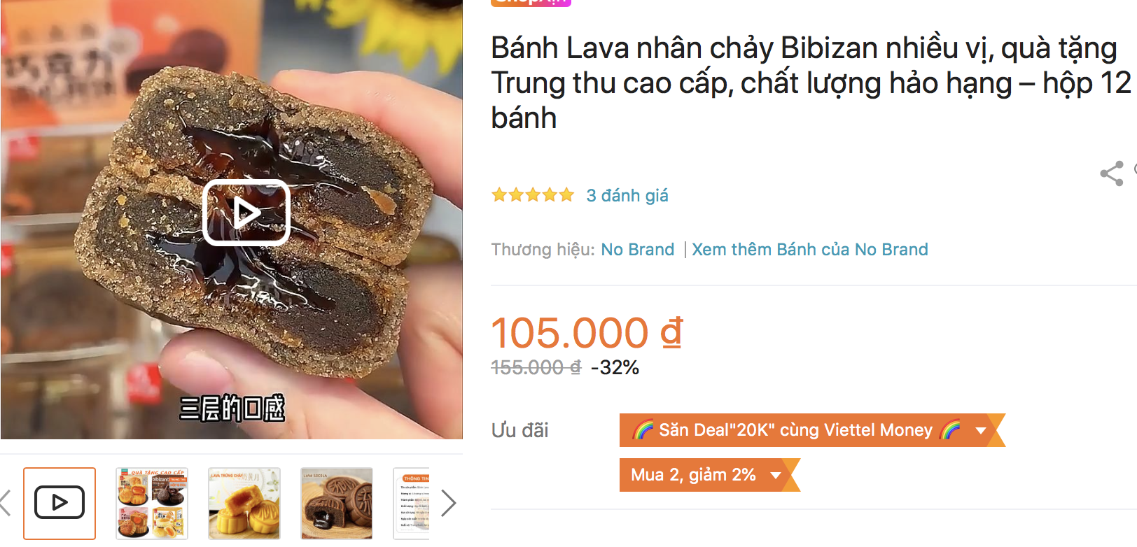 Đơn cử, trên Lazada, dù được quảng cáo là quà tặng trung thu cao cấp, chất lượng hảo hạng xuất xứ Trung Quốc, hạn sử dụng 90 ngày bảo quản ở nhiệt độ thường nhưng một hộp 12 bánh giảm giá 32%, từ 155.000 đồng xuống còn 105.000 đồng.