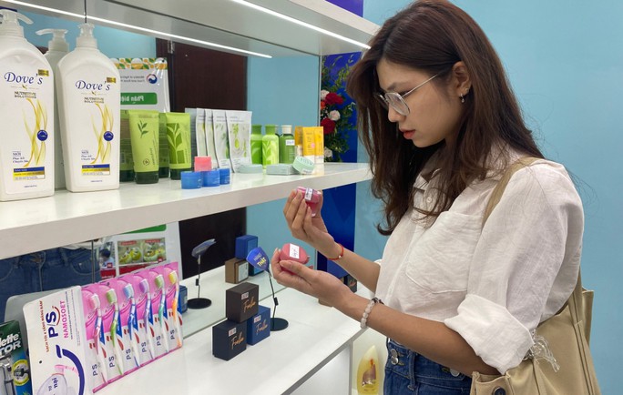 Một khách hàng tìm hiểu điểm khác nhau giữa hàng mỹ phẩm thật và hàng giả