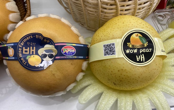Sản phẩm lê nhập khẩu chính hãng từ Hàn Quốc (bên trái), lê giả nhãn hiệu nhập khẩu (bên phải)
