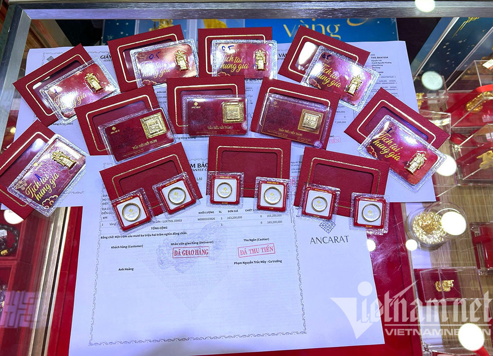 Còn chị Phùng Thị Liên ở Điện Biên thì mới đặt mua 2 lượng vàng miếng SJC và 4 chỉ nhẫn tròn trơn cùng đồng vàng Thần Tài. Số vàng này chị đã thanh toán xong, chờ sáng mai đúng ngày vía Thần Tài qua cửa hàng lấy vàng, đỡ phải xếp hàng.
